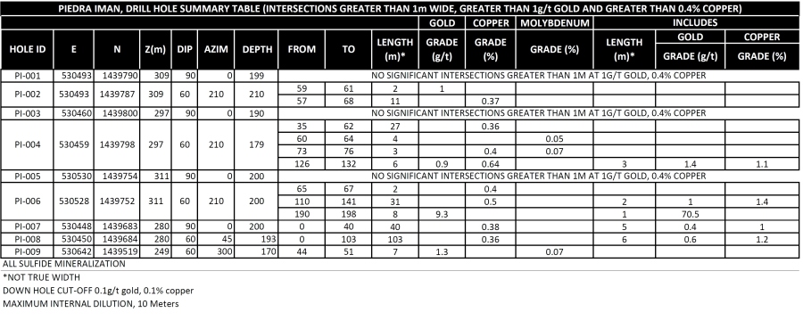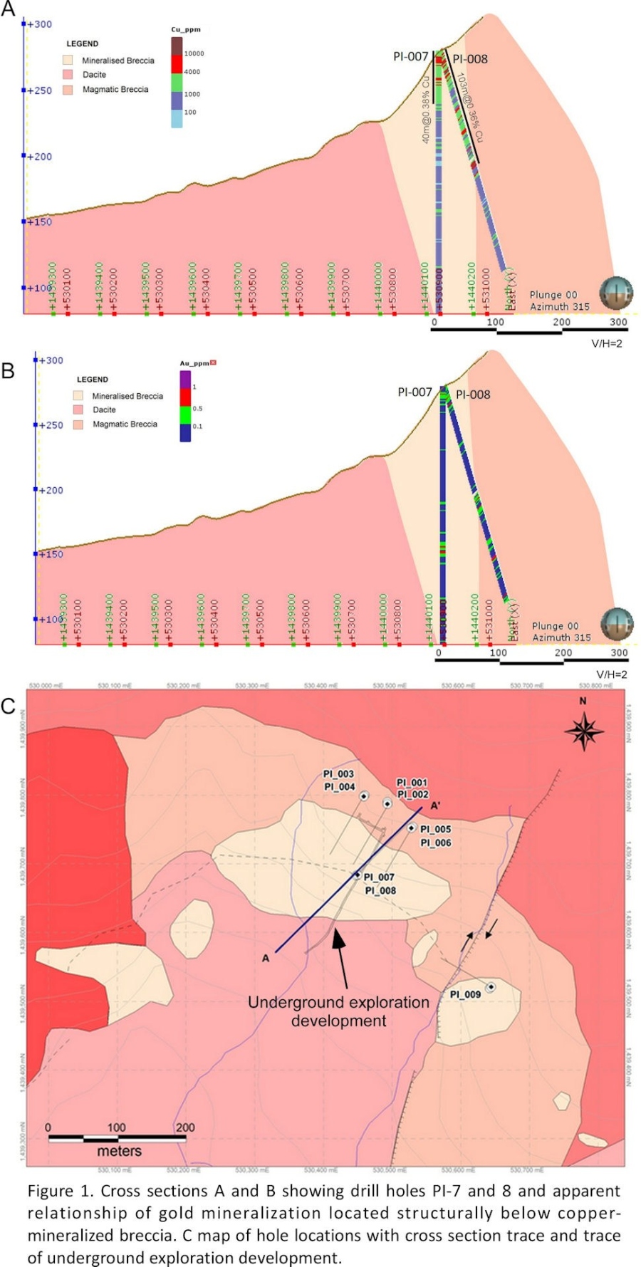 Results from this drilling program include best intersections of PI-006; 8 meters at 9.3 grams per tonne gold and 31 meters at 0.5% copper, PI-008; 103 meters at 0.36% copper and PI-007, 40 meters at 0.38% copper (see Table 1). Gold and copper mineralization are hosted in the same magmatic breccia but are spatially distinct, with gold generally occurring structurally below the copper mineralization (see Figure 1). Gold mineralization is commonly related with molybdenum and accompanied by albite, actinolite, tourmaline and magnetite. Gold mineralization appears to be superposed on the overlying copper-mineralization which is generally accompanied by potassium feldspar. The occasionally high-grade (up to 70.5 grams per tonne) and irregular distribution of gold in duplicate sample results suggests that it is coarse in nature.