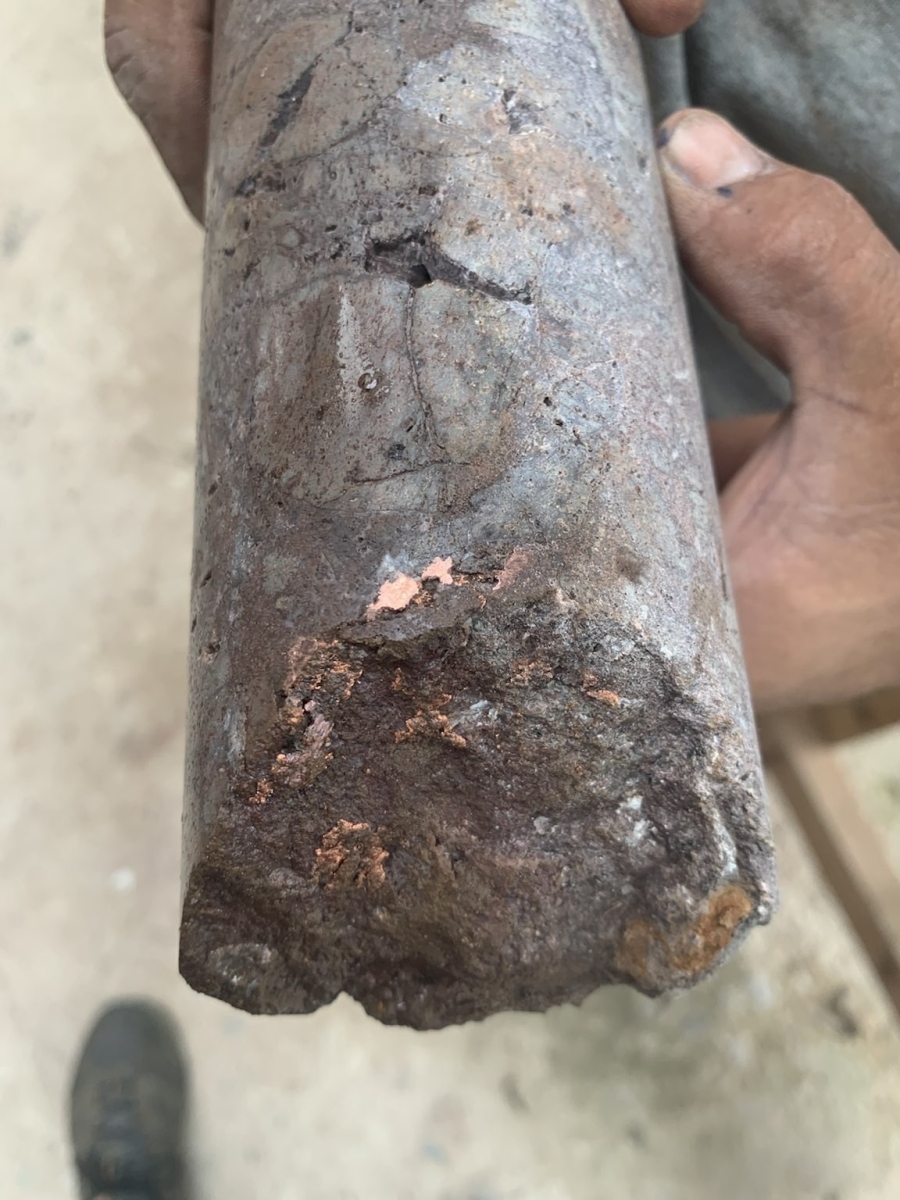 Drill core photos, showing sulphide-matrix breccia from Caribe drill holes 25 and 28 and native copper from drill hole 27. Results awaited