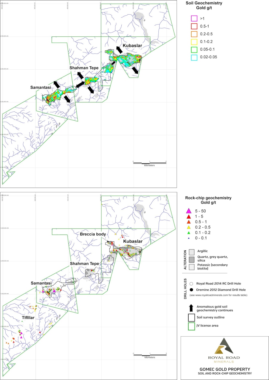 The Company is now preparing for a follow-up drilling program which is expected to commence before July of 2015. Soil geochemical surveys have been extended, further reconnaissance rock-chip sampling has been conducted across the entire project area (see Figure 1) and IP geophysics is currently underway. The soil geochemistry has further extended areas of known gold mineralization and identified new areas for further sampling to the northeast and southwest of existing anomalies (Figure 1). Reconnaissance rock-chip geochemistry has highlighted new gold mineralization associated with what appear to be dome bodies at Tıfıllar and breccia bodies to the north of the Kubaşlar area (Figure 1).