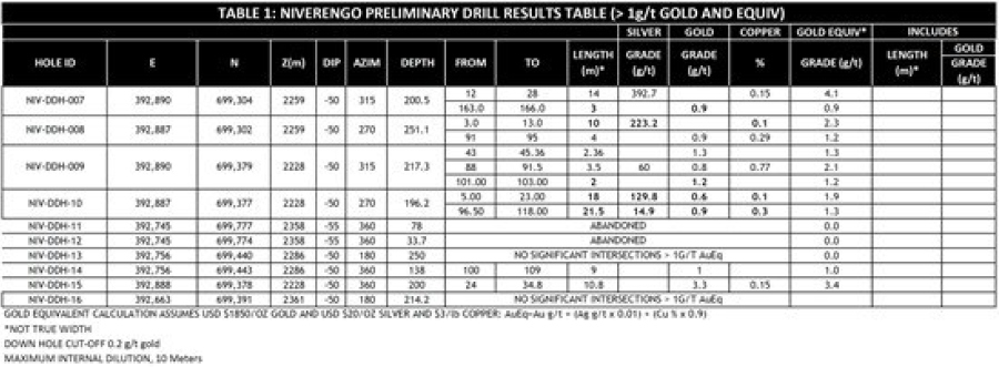 • NIV-DDH-010 18 meters at 1.9 grams per tonne gold equivalent; and