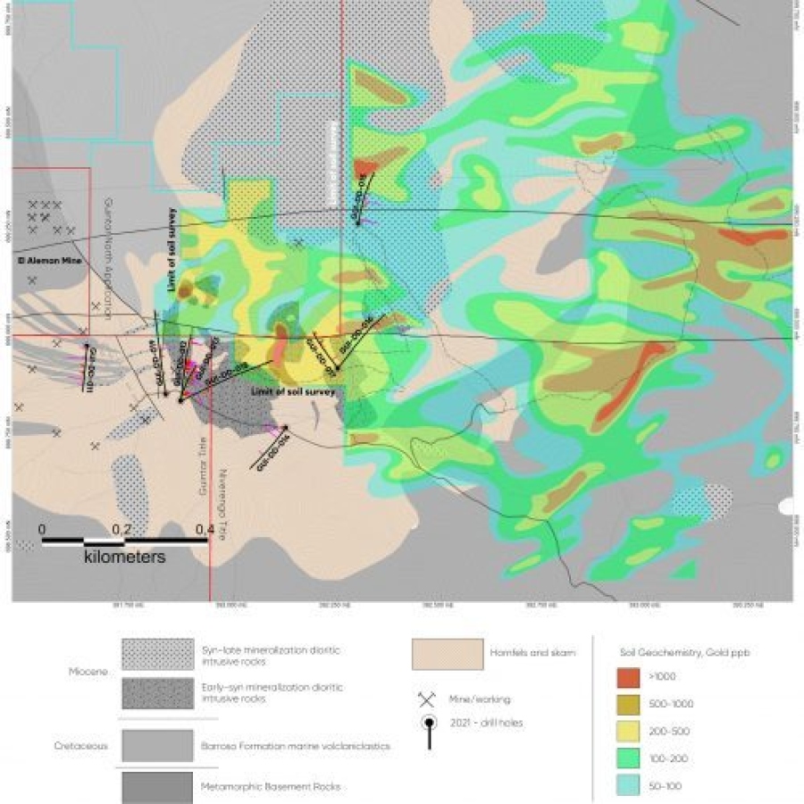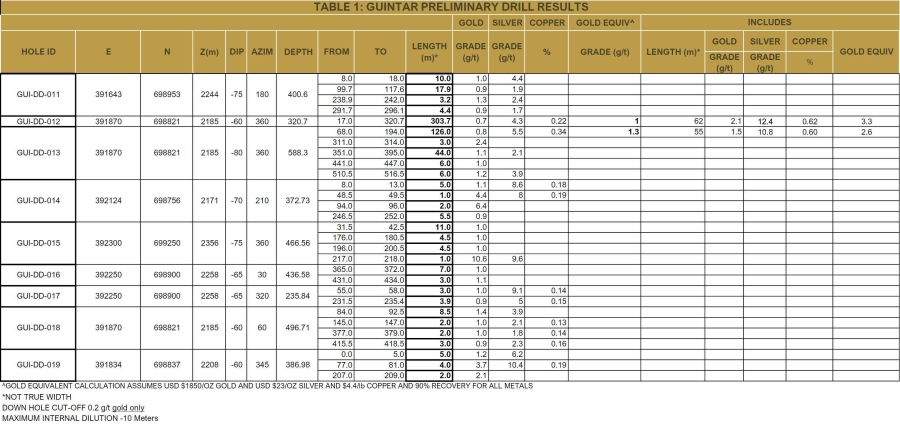 The Company has received results from the remaining six diamond drill holes from its 2021 drilling program at the Guintär project, details are presented in Table 1. Results did not identify any immediate southward extension to the copper and gold mineralization intersected in drill holes GUI-DD-011 and GUI-DD-012 (see Press Release December 14, 2021). However, all drill holes, whether in skarn, hornfels or intrusive rocks, returned relatively long intersections of anomalous gold and copper (for example GUI-DD-15; from 0 to 240 meters at 0.3 grams per tonne gold and GUI-DD-19; from 252 meters to end of hole, returning 135 meters at 0.12% copper) which, together with detailed logging of alteration intensity and intrusive paragenesis, will assist in locating drill holes for the follow-up drilling program which is now underway.