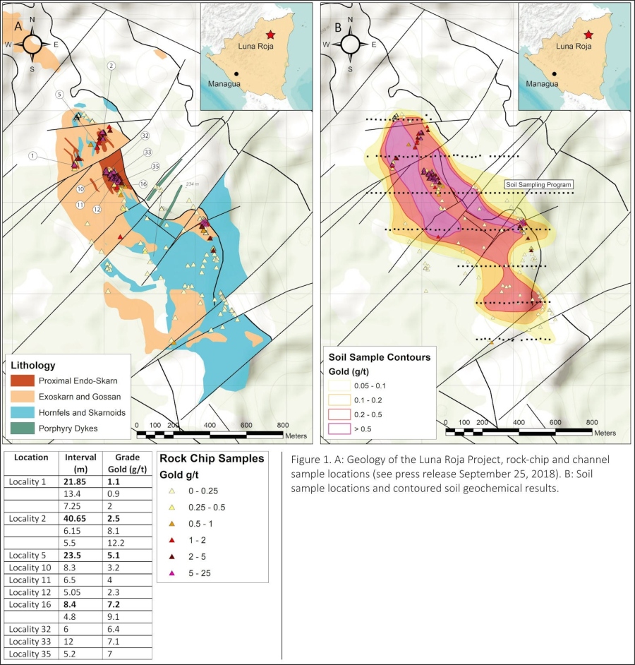 The company has previously collected 318 continuous rock-chip channels from 50 localities across the project (see Press Release September 25, 2018 and Figure 1), Best results included 40.65 meters at 2.5 grams per tonne, 23.5 meters at 5.1 grams per tonne, 12.0 meters at 7.1 grams per tonne and 5.5 meters at 12.2 grams per tonne gold.