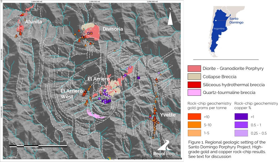 The Santo Domingo district is located 120 km east of San Juan City at an average altitude of approximately 1,200 meters above sea level. The district comprises at-least three exposed porphyry copper-gold-molybdenum occurrences (El Arriero, Divisoria and Alunita) and a vein-hosted gold and polymetallic vein system (Yvette) located within a mineral rights package covering a total area of approximately 185 square kilometers. Royal Road has entered into an option agreement with an individual titleholder to acquire 100% of the mineral rights package (see Press Release, February 15, 2023).