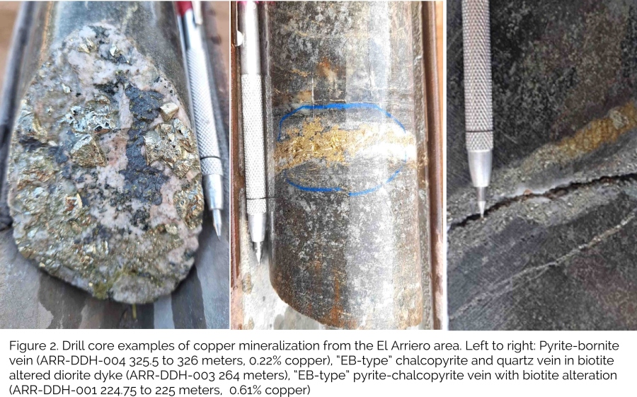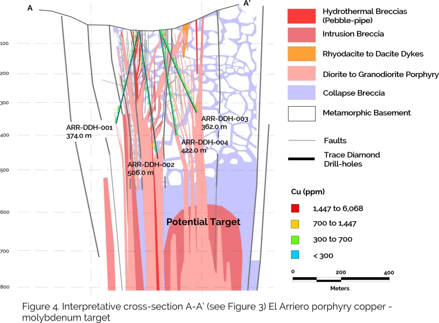 Four diamond drill holes were drilled into the El Arriero target for a total of 1664 meters (see Figures 3 and 4, link here to drill results table). Drill holes targeted copper soil-geochemical anomalies and rock-chip channel results and intercepted potassic-altered diorite porphyry dyke bodies and granodiorite emplaced into a discrete poorly-sorted collapse breccia. B-type quartz, pyrite, chalcopyrite veinlets and micro-breccias in diorite dykes returned anomalous copper (up to 0.7 % Cu, average 0.03%) and molybdenum contents (up to 0.19%, average 36ppm) associated with biotite alteration. Granodiorite dyke bodies are interpreted to be a later mostly barren intrusive phase related to a sericite - illite alteration overprint. Drill holes did not intercept economic copper or molybdenum grades over significant widths, with the exception of AR-DDH-001 however, which drilled out of the breccia body and into the wall rock, all drill holes remained in the potassic altered and weakly mineralized dyke and breccia system implying potential for a more assembled porphyry target at depth where the diorite dykes may coalesce. Drill hole AR-DDH-004 ended in 4 meters at 0.01% molybdenum.