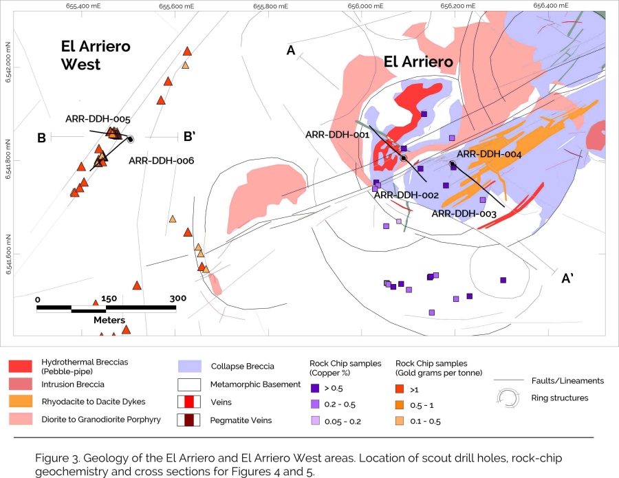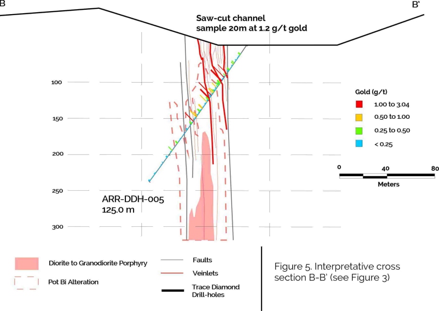 Scout drilling, mapping and rock-chip geochemistry (including historic samples) reveals a more broadly distributed copper and high-grade gold porphyry system which includes the Divisoria and Alunita occurrences and essentially surrounds El Arriero, extending over an area of approximately 10 square kilometers and eastwards to the Yvette polymetallic vein system (see Figure 1). Gold and copper values are associated with magnetite rich breccias, quartz-magnetite veinlets, and sheeted veinlets related to porphyry dykes. As part of this scout drilling program two drill holes, ARR-DDH-005 and 006, totalling 298 meters were drilled into the copper-gold system adjacent to El Arriero and beneath and in the vicinity of a continuous saw-cut channel sample which returned 20 meters at 1.2 grams per tonne gold. Best results from drilling were 5 meters at 0.9 grams per tonne gold (ARR-DDH-006 from 70-75 meters) with most other intersections of greater than 1 gram per tonne gold limited to one meter or sub-meter intervals (see Figure 5). The Company is planning airborne magnetics and radiometrics to best define future drill-targets within this extensive zone of alteration and mineralization.