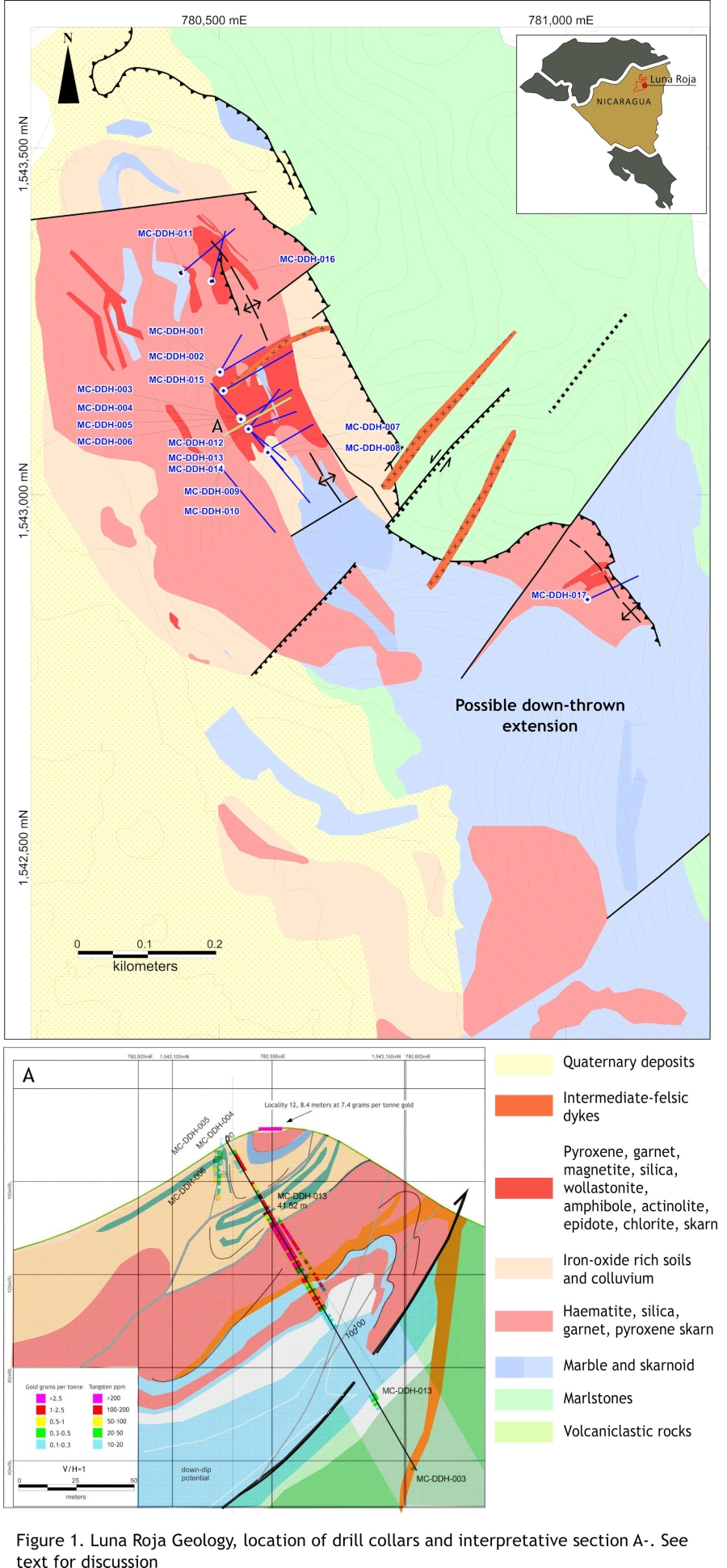 The drilling program at Luna Roja aims to test the sub-surface extension of surface gold mineralization identified in saw-cut channel samples (see press release; September 25, 2018) which returned significant intersections including, 40.65 meters at 2.5 grams per tonne, 23.5 meters at 5.1 grams per tonne, 12.0 meters at 7.1 grams per tonne and 5.5 meters at 12.2 grams per tonne gold (channels are oriented perpendicular to strike). These drilling results indicate that gold mineralization remains open at depth (down to 150 meters vertical depth, LR-DDH-005) and open along-strike to the northwest and southeast. The southernmost and final drill hole of the program, LR-DDH-017 is located approximately 450 meters to the southeast of previous drilling and intersected 8 meters at 0.9 grams per tonne gold from surface. Geological mapping suggests that LR-DDH-017 was collared into a window of skarn mineralization located stratigraphically below an overlying sequence of marble and skarnoid rocks (see Figure 1). These drilling results, together with geological observations, suggest that gold mineralization at Luna Roja extends along an antiformal fold hinge, significantly southwards and under cover, for a total mineralized system of approximately 1400 meters in strike distance.