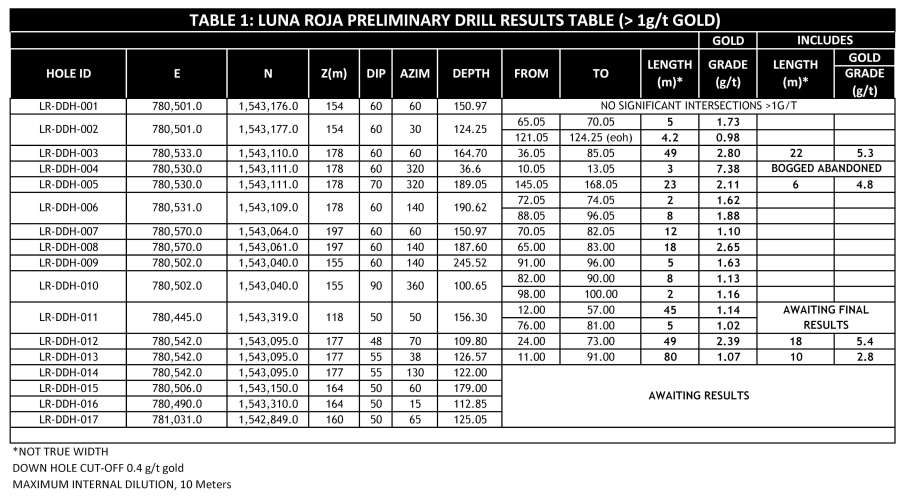 Royal Road and Hemco have completed an initial 17-hole, 2472 meter, scout drilling program at Luna Roja. This is the first drilling program to be completed on the project. Results have now been returned for all drill holes (see Table1; and press release; September 4, 2019, intersections are not true widths and the Company does not have sufficient information to make a determination of the true widths of the drill hole intersections of the mineralized zone). Significant intersections include: