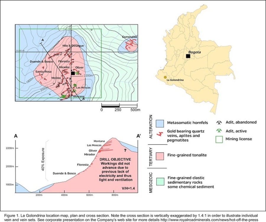 “We are very excited about our prospects at La Golondrina” said Dr. Tim Coughlin, Royal Road Mineral’s President and Chief Executive Officer. He added that “The La Golondrina project ticks a number of boxes for us; firstly, the gold grade in the veins and in the vein zones offers the potential for the possible development of a substantial and highly profitable high-grade underground or open-pit mining project; secondly, there are three permitted and operating CIL facilities within close proximity to the project; thirdly, our relationship with the current owners offers the Company a head start in a number of important areas, including, community relations, and fourthly, the La Golondrina project is located in a prolific high-grade gold producing area where there may be opportunities for the Company to evaluate and, if deemed advantageous, acquire other mineral properties. Our current intention is to focus our efforts on the La Golondrina project and to become an exemplary member of the mining community in the Nariño province. We plan to commence work by conducting a laser assisted survey of all accessible underground workings, completing saw cut channel samples on multiple levels and defining targets for surface drilling as early as possible in 2016.”