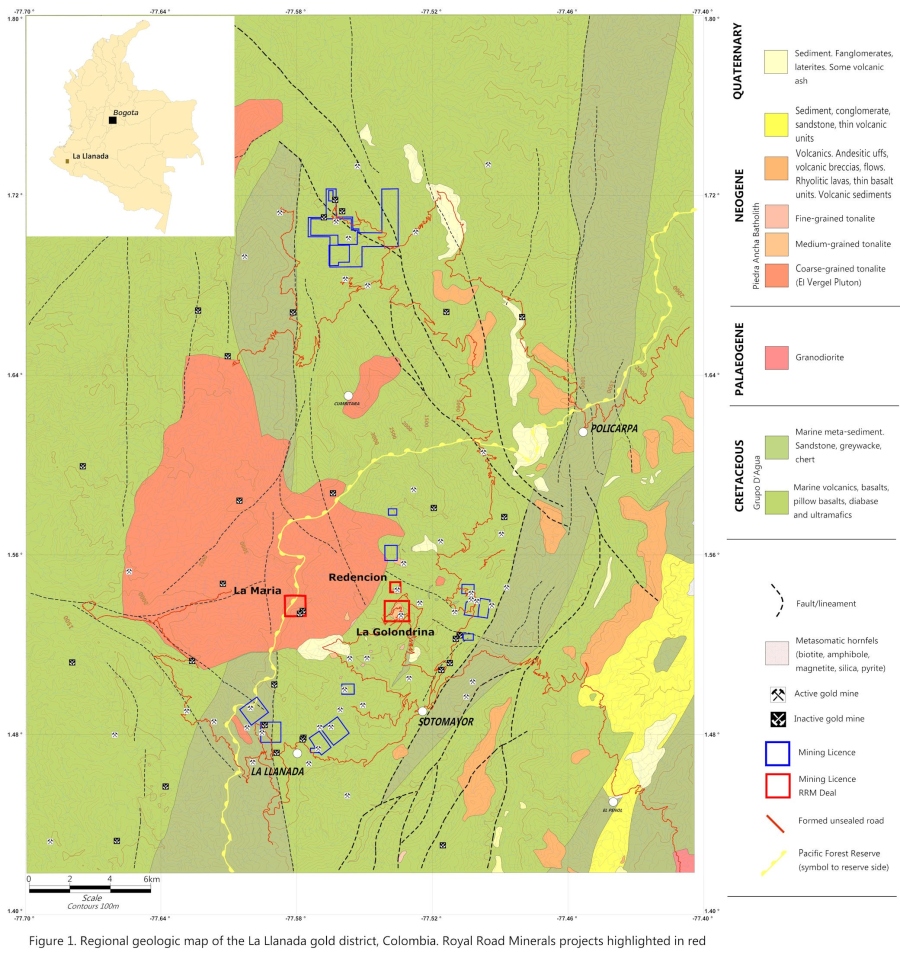 “We are delivering on our plan of consolidating and expanding our presence in this remarkable gold district” said Tim Coughlin, Royal Road’s President and CEO. He added, “La Maria is the third such agreement we have made in La Llanada in the last ten months. Every time we advance such exclusivity arrangements to full option agreements we make valuable new local partners and stakeholders which we believe are vital components of a successful and sustainable exploration and development program. We are excited about the vein-hosted gold potential at La Maria and also intrigued by the chance of finding what may be bulk-tonnage, pegmatite-hosted gold mineralization at the project”.