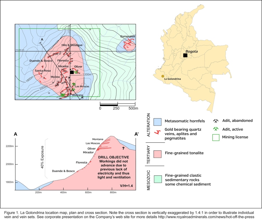 “This is an exciting development for our Company” said Tim Coughlin, Royal Road Mineral’s President and Chief Executive Officer. He also stated: “The La Golondrina project has clear and immediate potential to become a significant high-grade gold resource and we consider the region it is located in to be one of the most prospective and currently permittable in Colombia. The move into Colombia is not an unnatural one for us; our team has extensive South American experience. I worked on gold exploration in Colombia over the years 2001-2005 and count it as one of the most prospective countries in the World. Indeed, the fact that some 50M new reportable gold ounces have been discovered there in the last 12 years is, in our opinion, testament enough to that. Our immediate focus of course is La Golondrina and capital raised during this investment round is destined for in-ground investment there. If our due diligence proves satisfactory at El Alacran and if there is acceptable finance or a suitable partnership available to help us develop that project, then the Company will advance there also.”