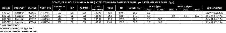 A notable characteristic of drilling results at Gömeç are the long low grade intersections which host the greater than 1 gram per tonne gold intervals (see Table 1). For example, GRC-024 (10 meters at 1.0 g/t gold) returned 110 meters at 0.5 g/t gold from 62 to 172 meters down-hole depth and GRC-027 returned 82 meters at 0.7 g/t gold from 92 to 174 meters down-hole depth. Management believe that these long low-grade intervals, which are hosted in fault zones and along layering in a sequence of volcanic rocks, may be indicative of underlying higher grades in crystalline basement rocks located structurally beneath the volcanic pile.