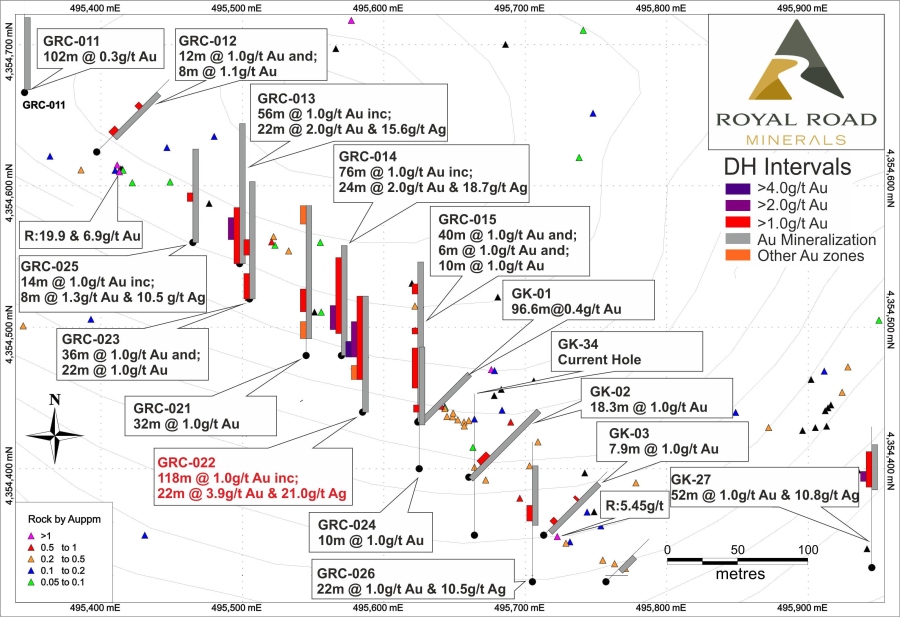 “Drill hole GRC-027 is located 200 meters away to the east of the broadly northwest oriented fault zone intersected in previous drilling” said Tim Coughlin, Royal Road’s President and CEO “There is no obvious structure at surface near GRC-027 which hints at more than a simple fault control to gold mineralization at Gömeç and provides some further encouragement in terms of size potential. We are awaiting the re sults of step-out drilling into basement-hosted alteration zones and along the ridge to the southeast at Gömeç, but reverse circulation drilling has now ceased and has been replaced with diamond drilling, at no additional cost, to drill a further three drill holes testing deep targets at the project.”