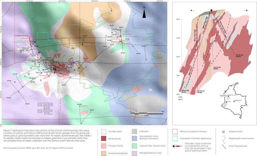 Drilling at Guintär commenced in July of 2021 and was aimed principally at testing for an underlying intrusive or porphyry-related source to the gold and copper mineralization which had been intersected in previous drilling and is evident in surface geochemical sampling over an area of more than 10 square kilometers (see Figure 1).