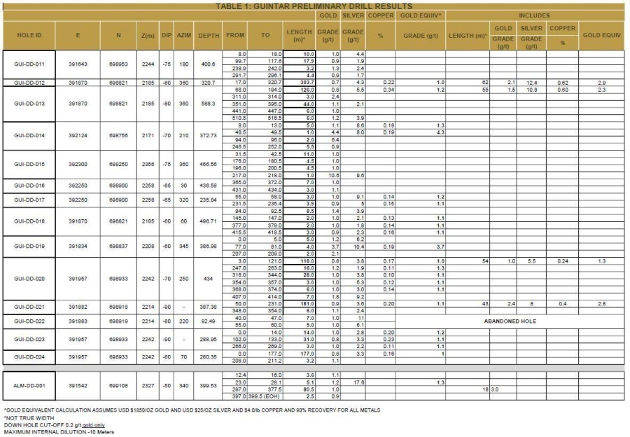 Results to-date have been encouraging and include; GUI-DD-012, 303.7 meters at 1.0 grams per tonne gold equivalent¹ (including 62.0 meters at 2.1 grams per tonne gold, 12.4 grams per tonne silver and 0.62% copper), GUI-DD-013, which returned 126.0 meters at 1.4 grams per tonne gold equivalent, GUI-DD-020 which returned 118.0 meters at 1.0 grams per tonne gold equivalent and GUI-DD-021 which returned 181.0 meters at 1.1 grams per tonne gold equivalent (including 43.0 meters at 2.4 grams per tonne gold, 8.0 grams per tonne silver and 0.40% copper), from diorite-hosted, porphyry-style mineralization.