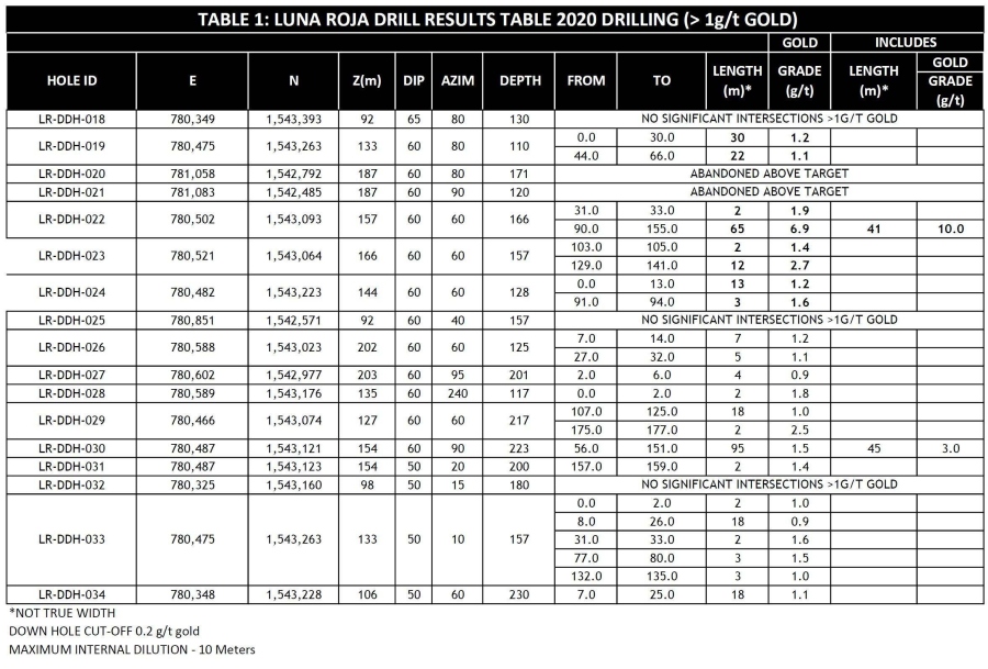 A follow-up drilling program commenced at Luna Roja on May 2nd of this year. The initial stage of this program comprises approximately 3000 meters of diamond drilling aimed at locally extending known gold mineralization and exploring newly identified and deeper targets identified by ground microgravity. Initial results from this drilling program returned significant results including LR-DDH-22, 65m at 6.9 g/t gold (including 41 meters at 10.0 g/t gold- see press release July 13 2020).
