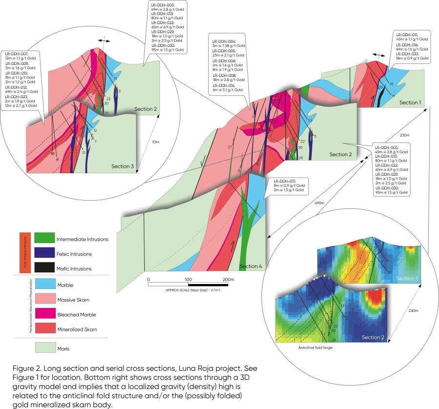 Drill results received to-date, support the interpretation that gold mineralization extends at depth and down plunge towards the northwest at Luna Roja. This is consistent with the orientation of the anticlinal fold structure which is believed to be the primary structural control to gold mineralization at the project (see Figures 1 and 2). Drill hole LR-DDH-34 in the northwest of the project area intersected gold mineralization at a distance of approximately 200 meters across strike from the gold mineralized anticlinal fold structure. This drill hole has identified what may be a new gold mineralized zone at Luna Roja or the folded and/or perhaps faulted continuation of known gold mineralization.