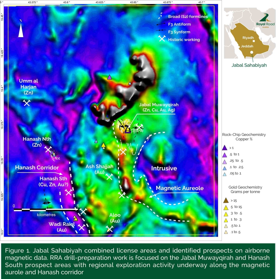 Dr Tim Coughlin, Royal Road’s President and CEO stated: “Systematic exploration work at Jabal Sahabiyah is identifying local and district-scale potential at several localities. Key to the polymetallic potential of these localities is repeat geochemical sampling using modern analytical techniques to better assess particularly the gold content of exposed mineralization. This is evident at Jabal Muwayqirah, where the addition of gold from RRA’s grab sampling has elevated copper equivalent grades to a maximum of 16.5% and increased the economic potential of the prospect area. Also important at Jabal Sahabiyah and elsewhere is testing beneath transported cover or wadis. We now have several examples of gossan occurrences occurring as erosional remnants along the immediate banks of wadi’s or as sub crop from within the wadi itself. In the case of Hanash South, Riofinex collared all of their drill holes from within the wadi and at Jabal Muwayqirah our immediate targets are evident as subtle auger anomalies and drone magnetic responses from beneath three meters of transported cover. We look forward to drill-testing our models in the coming year”