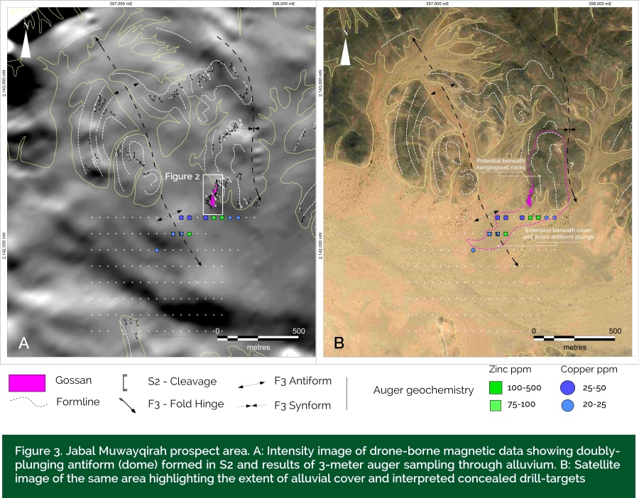 Mapping and new drone-borne magnetic data have revealed that exposed gossan at Jabal Muwayqirah is positioned on the limb of an (F3-generation) antiform (see Figure 3). Auger samples taken from 3 meters below the surface of alluvial sediments have identified subtle zinc and copper anomalism which defines a geochemical trend around the antiform towards its hinge. The geochemistry, structural mapping and magnetic data has highlighted a south-southeast plunging drill-target of approximately 500 meters strike extent and unknown (down-plunge) depth extent (see Figure 3). The gossan also continues beneath overlying metamorphic rocks to the north and may be exposed again around a synform and beneath alluvial cover to the east (see Figure 3). The Company is planning further auger sampling to test this model and has commenced the environmental permitting process for drilling at Jabal Muwayqirah. Drilling is expected to commence in the first quarter of 2025.