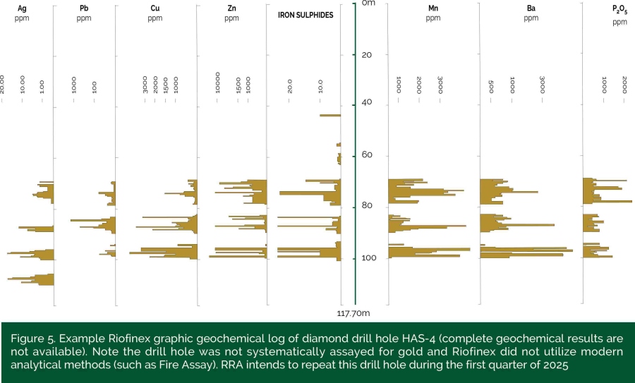 The Hanash South prospect area was discovered by Riofinex in the late 1970’s. Riofinex identified copper, zinc and silver mineralized gossans outcropping and sub-cropping along and within a wadi over a strike distance of approximately 1.6 kilometers (see Figure 4). Riofinex completed ground magnetics, induced polarization (IP) and self-potential (SP) surveys at Hanash South. The IP survey outlined an approximately 2.3-kilometer-long chargeability anomaly located beneath alluvial sediments (see Figure 4). Riofinex drilled seven diamond drill holes along the trend of the IP anomaly. All drill holes except for HAS-3 and 6, intersected (“layer-parallel”) sulphide intervals of from 25 to 90 meters thickness (see example log in Figure 5). The sulphide sections were anomalous in silver, zinc and copper. Some select samples were taken for gold analyses, but results were not reported. Estimated grades assessed from graphic logs (historic results are not available; see Figure 5) can be up to approximately 20 meters at 20ppm silver and 0.3% copper (visual estimate only, not JORC compliant). Highest reported grades over shorter intervals were 12.5% zinc and 0.4% copper over 1.7 meters and 46.4 ppm silver over 2.4 meters (Not JORC compliant).