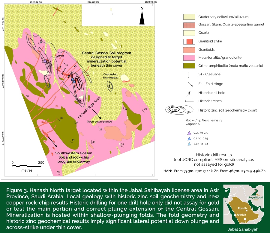 Recent field work by RRA has constrained mineralization to shallow-dipping, skarn-style zones of unknown overall thickness or repetition that have been refolded by (F2 or F3 generation) shallow-dipping, shallow-plunging, isoclinal folds (Figures 2 and 3). The result is variably exposed repetitions of “ribbon-style” mineralized bodies with potential for significant lateral extent and near-surface potential. Furthermore, reconnaissance rock-chip samples collected by RRA have returned higher copper and significant gold results (not historically analyzed) from Jabal Muwayqirah including up to 5.0% copper (Mean 1.1%, minimum 0.2% copper), and 7.5 grams per tonne gold (Mean 2.6 and minimum 0.5 grams per tonne gold). At the Hanash North target where rock-chip and soil sampling is currently underway, the fold geometry is interpreted to have repeated mineralization, exposing it again at the southwestern gossan area (see Figure 3) and concealing it under shallow cover towards the east.