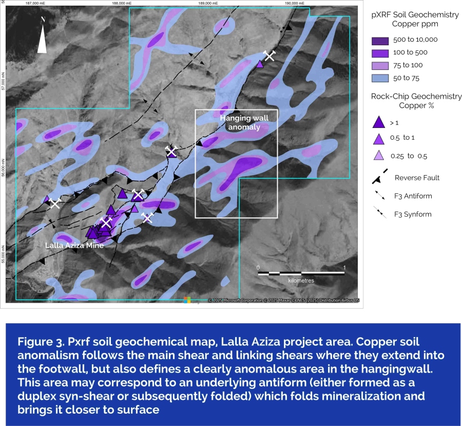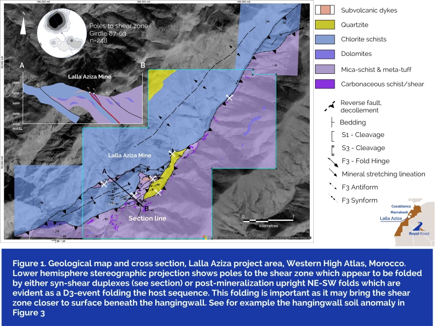 Royal Road has conducted geological mapping, underground and surface rock-chip and channel sampling and portable XRF (pXRF) soil sampling across the Lalla Aziza license area. Detailed findings are presented in Figures 1 and 3. The target concept at Lalla Aziza is a potential open-pit starter incorporating current workings, shear-controlled repeats and extensions in the footwall; immediate down-dip underground extensions below the current-level of the Lalla Aziza mine and folded repeats beneath the hangingwall to the southeast.
