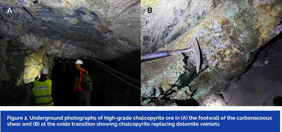 The mine area is located at the southwestern extent of Carbomine’s mining license area (see Figure 1). The mineralized shear-hosted vein-stockworks and breccia are nucleated on or close to carbonaceous schist and dolomite horizons and extend in a northeast direction across the license area for approximately 4 kilometers strike length. There is evidence for syn-mineralization sill-like intrusive bodies emplaced on or close to the shear zone. No previous exploration drilling has been conducted on the license area.