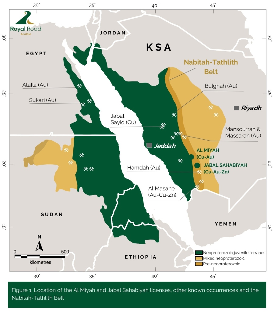Dr. Tim Coughlin, Royal Road’s President and CEO, stated: “It’s been 45-years since exploration work was conducted at Al-Miyah. Commodity focus and our understanding of exploration geology has changed profoundly since then. Our team have identified immediate copper and gold potential at known historic occurrences and at new prospects throughout the license areas. Saudi Arabia’s vision and proactive support for the mining sector is unparalleled as clearly evidenced by its innovative financial assistance schemes. It is a privilege for our organization to be at the forefront of mineral exploration in the Kingdom at this exciting transformative time”