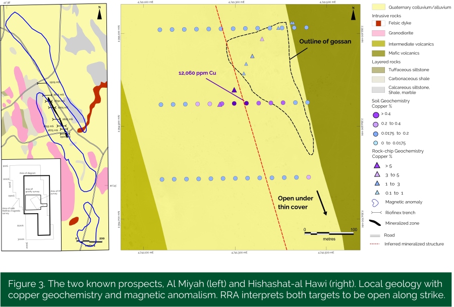 Historic exploration work was focused on volcanic massive sulphide deposits and was conducted by BRGM (the French geological survey) in 1969. This work comprised geological mapping, trenching and sampling, and identified mineralized gossans at two prospect areas known as Al Miyah and Hishashat-al Hawi (see Figure 2). In 1979 Riofinex Limited (a subsidiary of Rio Tinto Zinc), conducted ground geophysics at the Al Miyah prospect and identified a 1.5km long and 200-meter-wide northwest trending magnetic anomaly corresponding to a corridor of mineralized gossan. Historic samples containing malachite and haematite from 25-meter spaced trenches, over 450 meters of strike length, returned up to 2.4% copper (minimum 0.6% average 1.5% copper) and 3.2 grams per tonne gold (minimum 0.2, average 1.2 grams per tonne gold).