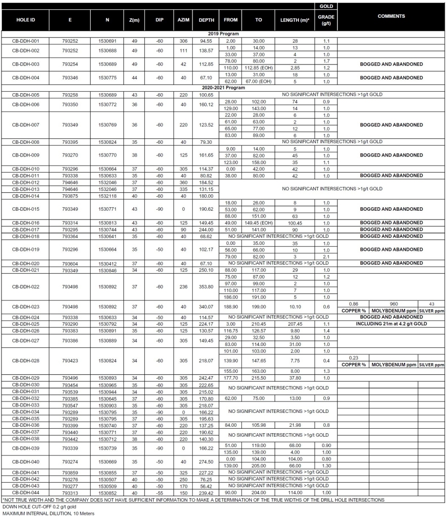 CB-DDH-044 114 meters at 1.0 grams/tonne gold