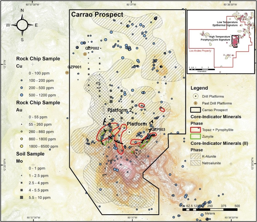 The Los Andes Copper Gold project forms part of the Company's 50-50 Strategic-Alliance agreement (see press release; September 6, 2017) with Mineros Nicaragua (a subsidiary of Colombia’s Grupo Mineros S.A. MINEROS:CB). The project is characterized by a 7 kilometer long, strongly altered caldera-controlled “lithocap” which hosts anomalous copper, gold and pathfinder elements in rock-chip geochemical samples. Previous exploration (Caza Gold - acquired by Royal Road, see press release; March 15, 2017) was focused principally on testing the gold-potential of the project. Exploratory drilling campaigns conducted in 2014 and 2015 targeted silicified lithocaps and intersected strong alteration and anomalous copper and gold. In 2015, an airborne geophysical survey was conducted over the area and highlighted a well-defined magnetic anomaly at the southern limit of the caldera structure, now known as the Carrao prospect area. Three drill holes were drilled in the area. All drill holes intersected anomalous copper mineralization with one drill hole (QZP-003), intersecting some 150 meters of massive pyrite, of a style interpreted to be consistent with the upper parts (pyrite-shell) of an underlying porphyry copper-gold system. Recent modelling and re-interpretation of the geochemical data collected from over 1500 rock samples, together with new soil geochemical analyses and short-wave Infrared (SWIR) satellite imagery, have highlighted an area of “porphyry core-indicator” and “porphyry core-specific” minerals and metals supporting the interpretation of an underlying porphyry copper-gold body. The geochemical and geophysical anomalies indicate that any potentially economic mineralization would be located at a depth in excess of 200 meters below the surface. The Royal Road exploration team has carefully positioned two scout drill holes to test the underlying porphyry copper-gold target (see Figure 1).