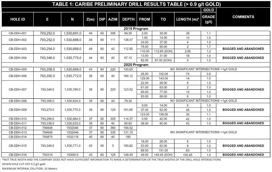 In the majority of cases, individual drill holes at Caribe have been unable to reach their planned objective due primarily to the effect of highly absorbent clays (formed within the host rock as part of the gold mineralizing process) swelling and arresting the drill rods. The Company has now completed a total of 20 drill holes and has briefly suspended the program in order to exchange the current drilling rig for a more powerful machine with the capacity to drill through the problematic clay and test the continuity of gold mineralization at depth.