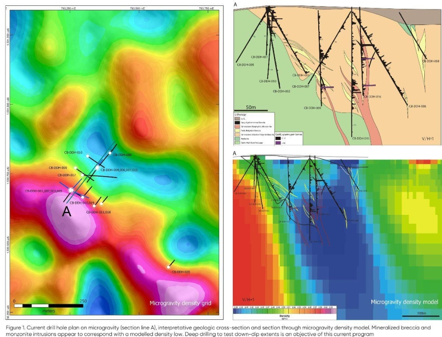 Gold, copper and molybdenum mineralization is hosted within a multi-phase broadly trachytic polymictic breccia body and within a porphyritic monzonite intrusion which appears to be emplaced within the breccia body as steeply dipping dykes (see Figure 1). Gold of up to 19.0 grams per tonne has been returned from within the porphyritic monzonite (CB-DDH-009, 130-131 meters). Alteration is predominantly sericite-illite-pyrite overprinted by silica with a late pervasive hematite. Although geological observations are limited to drill core only, the system is interpreted to represent an alkaline gold mineralized diatreme breccia with a possibly associated porphyritic intrusion at depth.