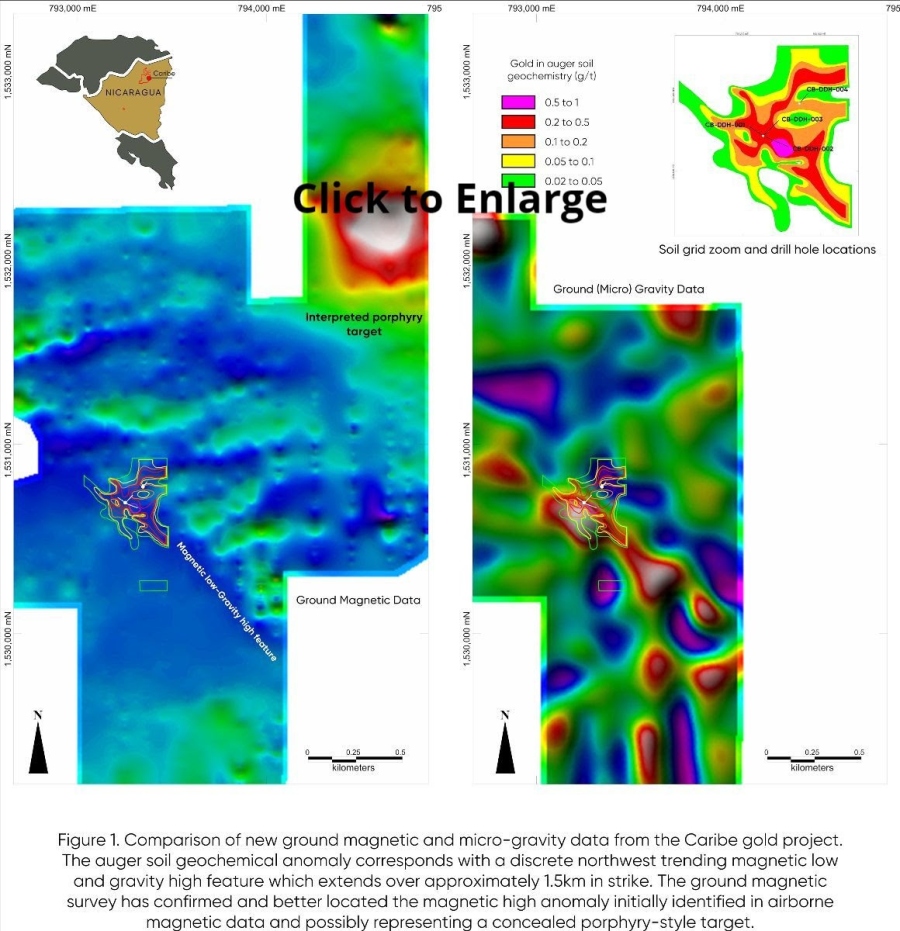 Caribe was initially discovered during reconnaissance follow-up of a discrete, approximately 500 meter diameter, magnetic high anomaly interpreted to represent the possible magnetic core to a porphyry copper and/or gold occurrence (see Figure 1). This anomaly is completely concealed and so surface samples could not be collected at its locality. New ground magnetic data has now confirmed the location of the airborne anomaly (Figure 1) and 3D inversion suggests that it is located between some 100 and 200 meters below surface. The location of auger sampling and scout drilling at Caribe is approximately 2 kilometers to the southwest of this anomaly and is associated with magnetic lows which parallel a strong and persistent gravity high feature over a strike length of some 1.5 kilometers.