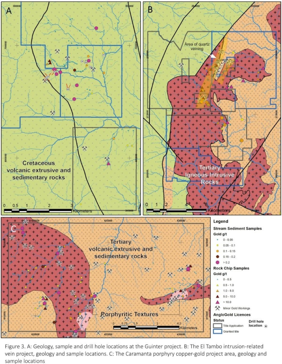 The Titles are grouped into two blocks, the Southern Block, which is located contiguous with Royal Road’s existing 3500 square kilometers of exploration rights in Nariño Province and the Northern Block, which covers the well-known Middle Cauca Belt, a region hosting over 50 million ounces of recently discovered gold resources (see Figure 1). There are 16 currently identified individual gold project areas located within the title package and numerous underexplored areas which management believes host significant geologic potential. Royal Road’s initial focus will be on granted titles containing targets that can be moved to the drilling-stage as soon as possible. Some of these targets are as follows: