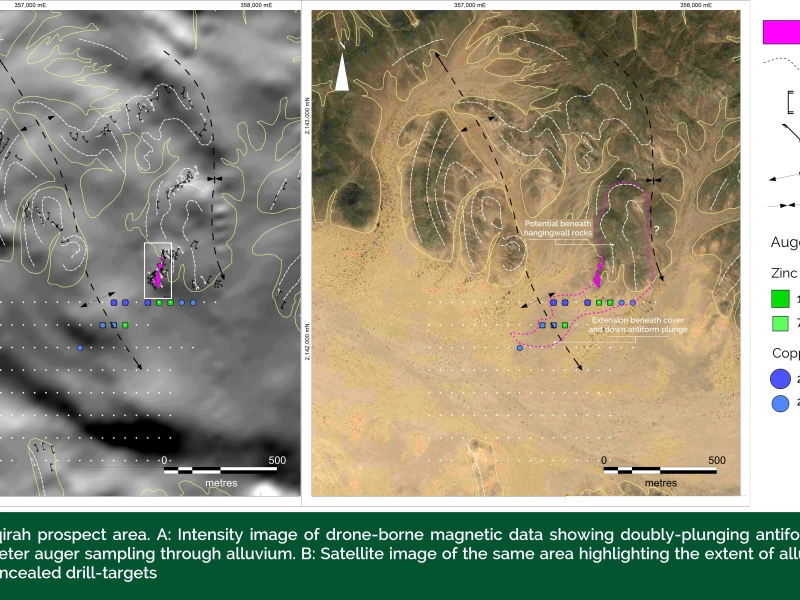 Royal Road Arabia has conducted, detailed mapping, surface geochemistry and drone-borne magnetics surveys across Jabal Sahabiyah and has prioritised three of the