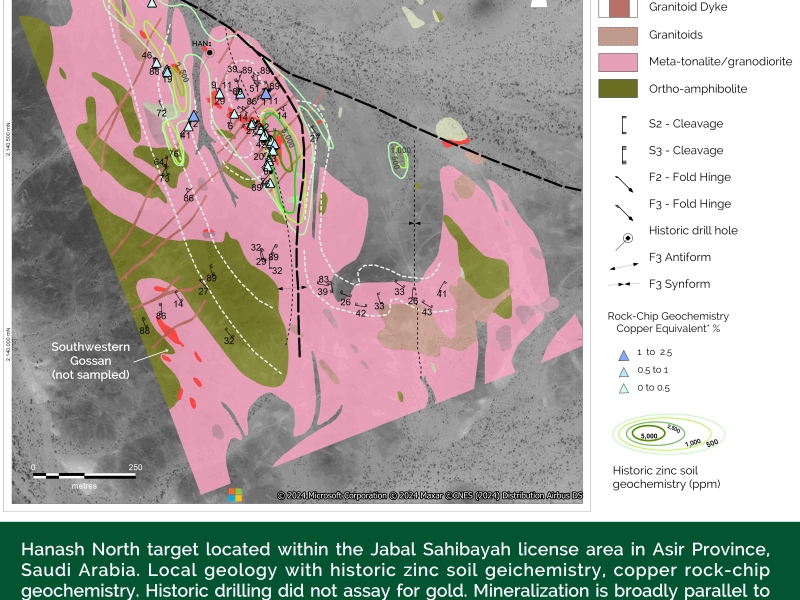 skarn-style prospects, Hanash South, Jabal Muwayqirah and Hanash North for further drilling. Furthermore, mapping and geophysics has identified some target areas concealed under dry river beds and sand for shallow RAB-style drilling in the first half of 2025. Importantly, Riofinex did not systematically analyse for gold, and historic silver and in some cases base metal analyses are repeatedly lower than the results Royal Road Arabia has received from surface sampling (Highest gold 9.3 g/t and highest silver 423ppm from Jabal Muwayqirah).