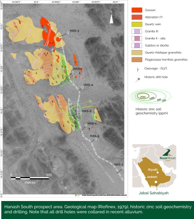 The Hanash South prospect area is of particular interest as Riofinex intersected up to 90 meters (downhole thickness) of blind sulphide material along a 2.3 kilometer strike length. Royal Road will redrill old Riofinex drill holes to test for gold and silver content.